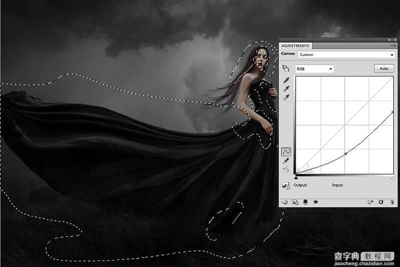 2.13 添加曲线【调整图层】,降低亮度,并在蒙版中用柔软的黑色笔刷减少对衣服、身体、脸部的细节效果